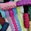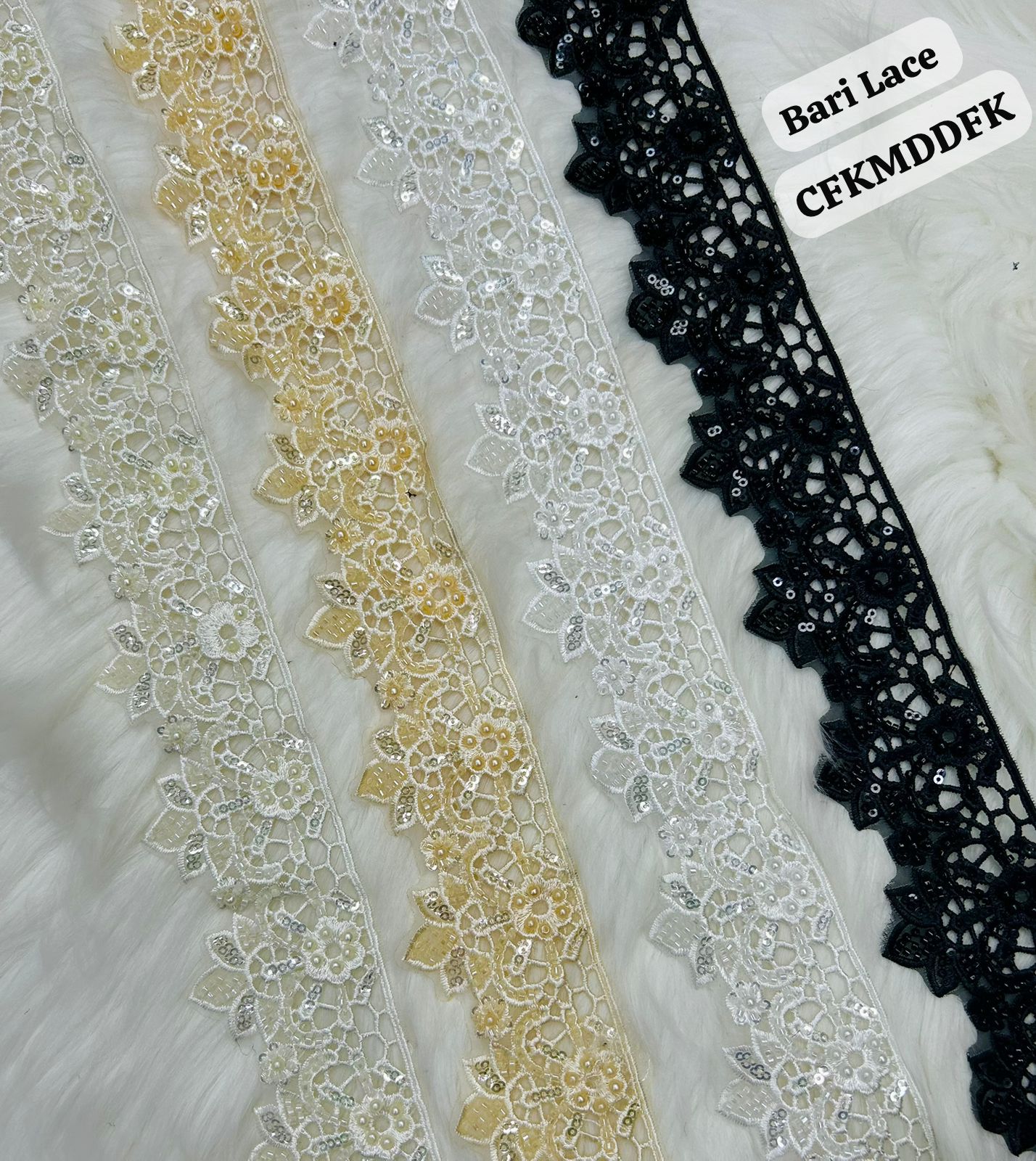 This high-end trimming (Code: CFKMDDFK) utilizes a geometric net base to support its intricate floral embroidery. The design features pointed petals decorated with sequins and micro-pearls, creating a refined “starburst” effect. The lace offers a structured yet flexible drape, ideal for modern ethnic wear and luxury evening gowns.