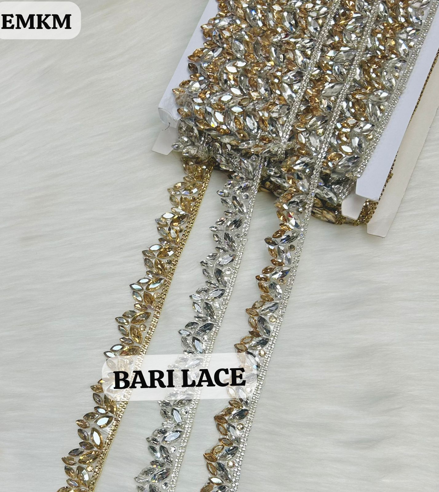 The EMKM lace is a high-density crystal trim that creates a lush, leaf-like effect. The crystals are arranged in an interlocking pattern to provide full coverage and a heavy shimmer. It is perfect for high-fashion garments that require a luxurious, hand-embellished look with the ease of a ready-made lace.