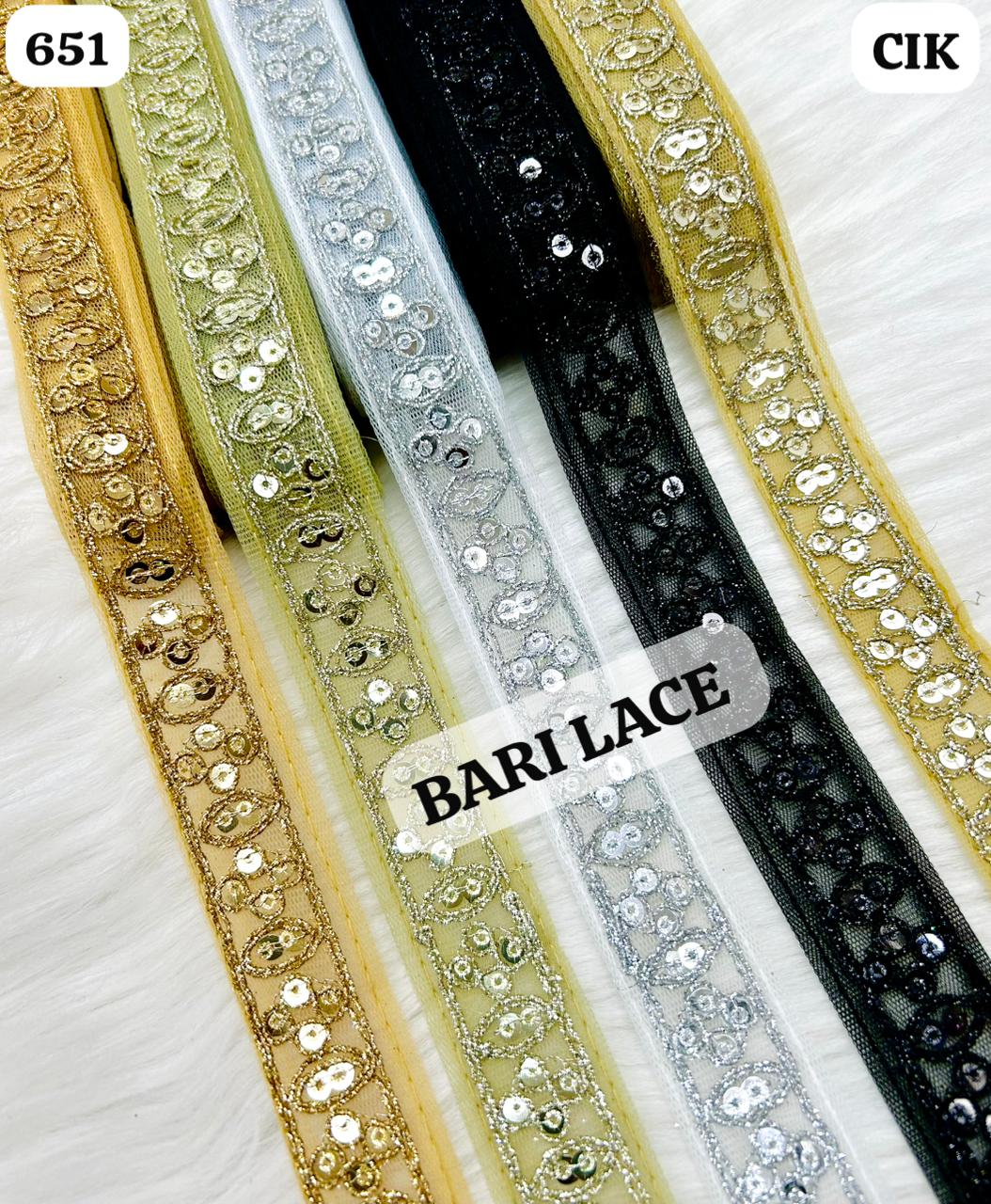 Designed for those who prefer structured elegance, the Bari Lace 651 (CIK) features a repetitive geometric oval design. The embroidery is densely packed with sequins, creating a “mirrored” effect that adds a touch of glamour to any garment. The narrow width of this trim makes it ideal for detailing necklines, sleeve cuffs, or even for use in contemporary DIY craft projects. Its clean lines and metallic finish provide a modern twist on traditional embellishments.