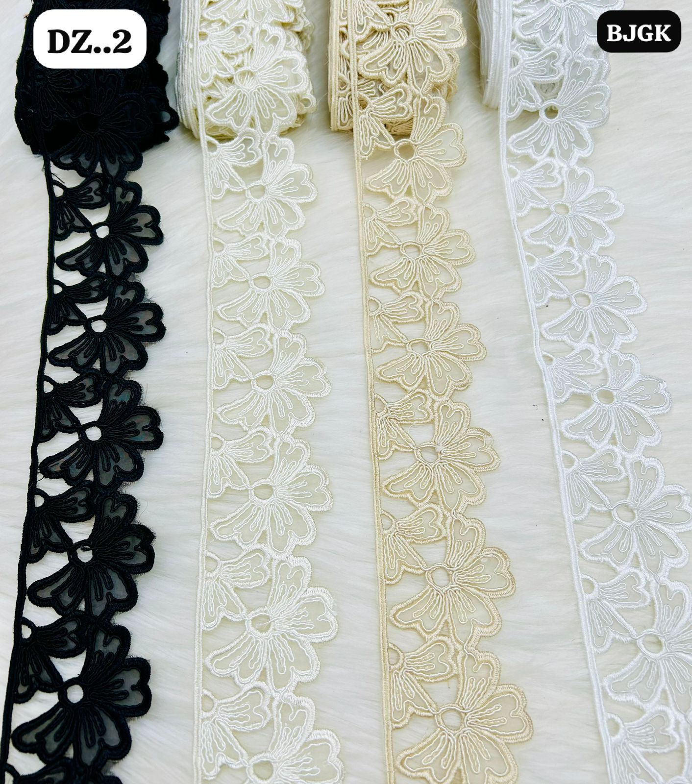 The BJGK lace offers a more contemporary silhouette. Unlike traditional mesh-backed lace, this “chemical lace” style features interlocking floral shapes with open-air gaps between the petals. It provides a beautiful 3D texture and a clean edge on both sides. Shown here in Black, Ivory, Sand, and White, it is perfect for creating “cut-out” details on necklines.