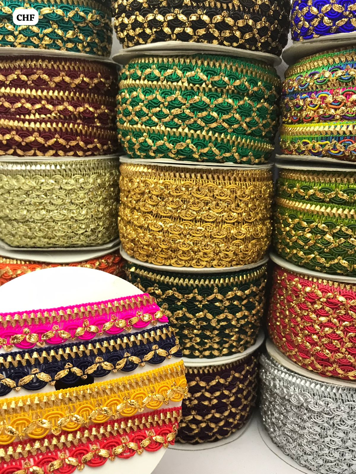Textured braided cord lace featuring a distinctive metallic gold “wheat” pattern overlay.