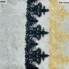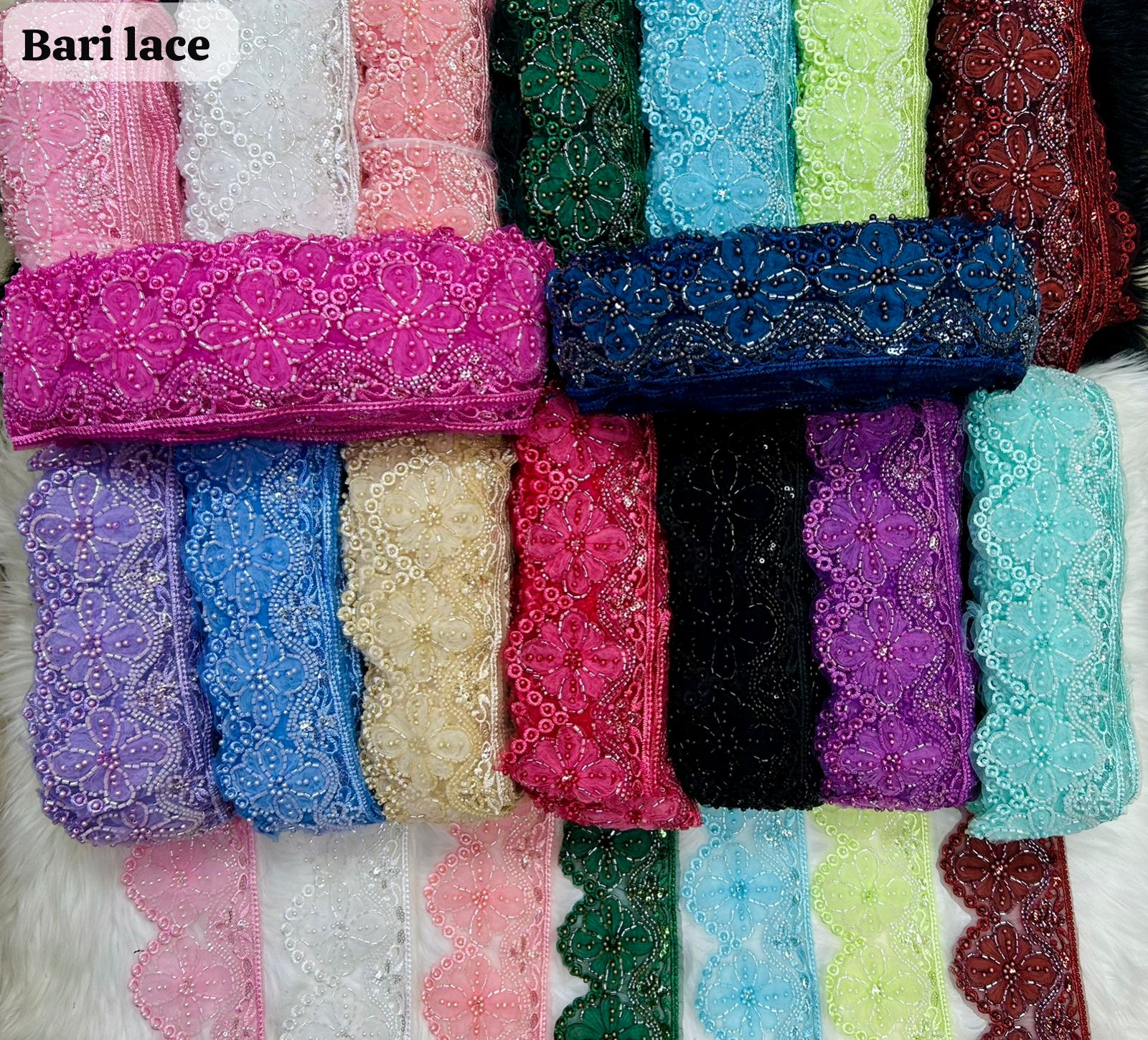 This expansive collection showcases Bari Lace’s signature floral medallion design in over a dozen vibrant shades, including magenta, royal blue, emerald, and maroon. Each medallion features a four-petal “cross” design highlighted by intricate beadwork and a shimmering sequin border. These rolls are designed for high-volume use in festive garment manufacturing where color-matching is essential.