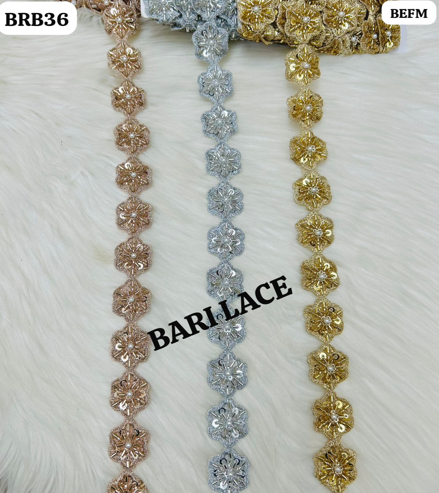 This BRB36 series showcases a sequence of interlocking floral frames. Each flower is heavily embellished with metallic bugle beads and a prominent central pearl for a high-relief, 3D effect. It is ideal for beltings, lehenga waistbands, or heavy dupatta borders. Available in antique copper, silver, and bright gold.