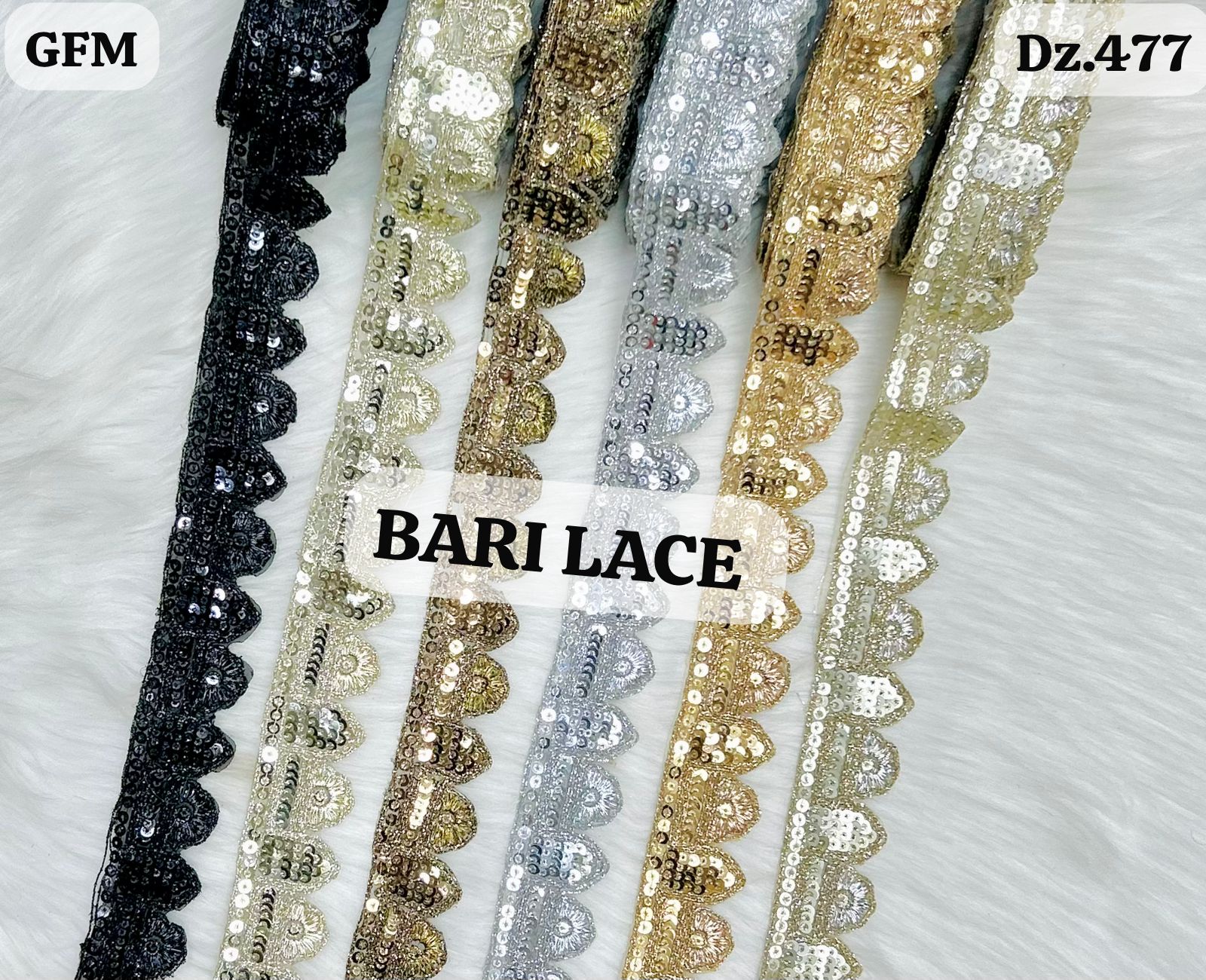 This striking design (D.z.477) features a “cog-wheel” or pointed scallop aesthetic. Each point is meticulously finished, with a large, round sequin-encrusted floral disk in the center of every segment. It is a bold choice for high-contrast fashion, providing a strong geometric silhouette to any garment edge.