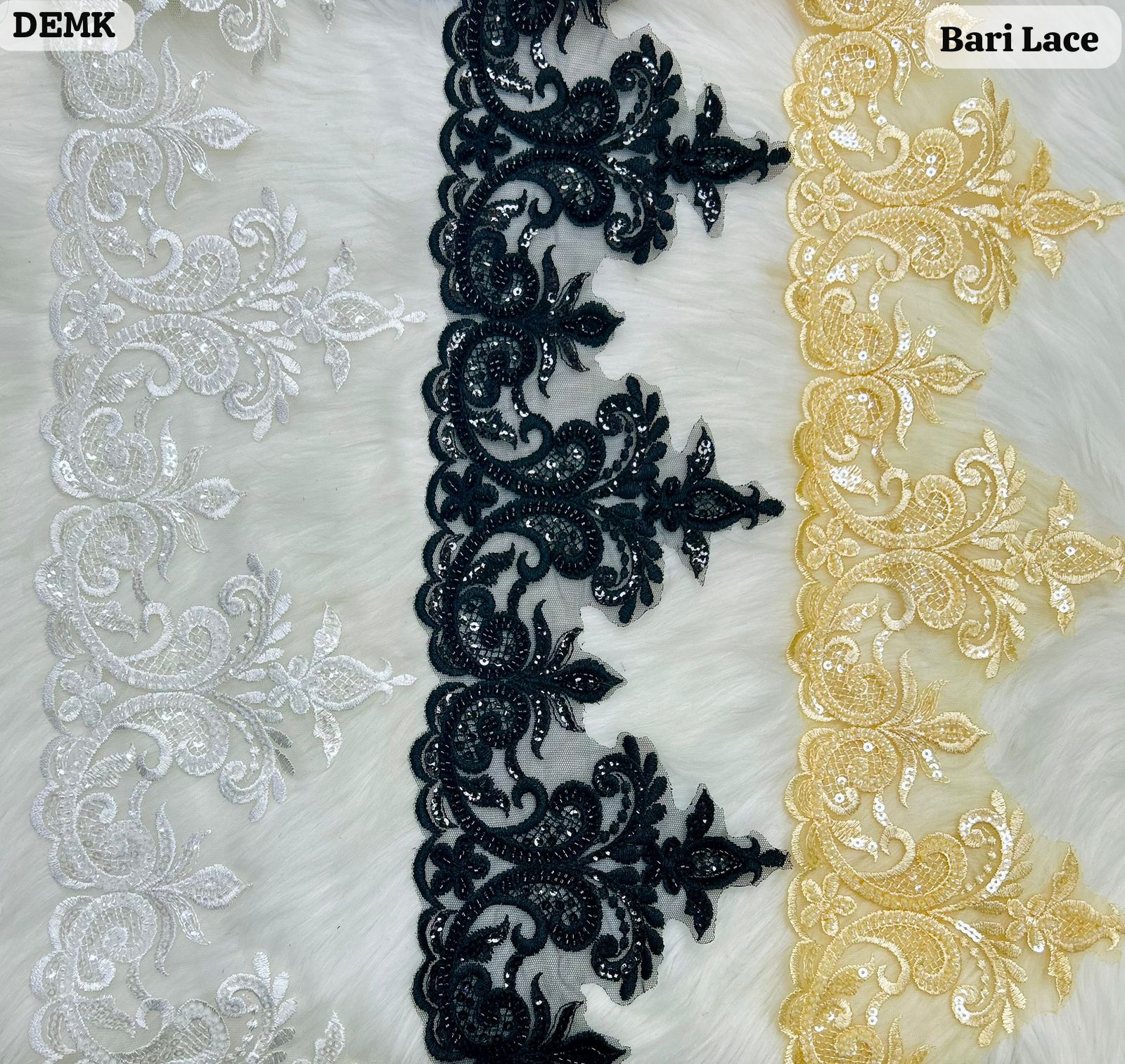 The DEMK series stands out with its architectural, baroque-inspired design. Moving away from standard florals, this lace features dramatic swirls and pointed gothic-style peaks. The pattern is intricately filled with shimmering sequins and fine threadwork on a sheer mesh base. Available in silver, black, and gold, it is perfectly suited for statement necklines or formal gown trimmings.