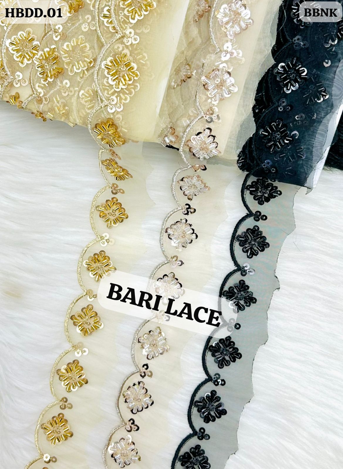 The HBDD.01 collection features a graceful scalloped edge that adds a soft, feminine silhouette to any garment. Each “petal” section is hand-finished with a central floral motif made of bugle beads and sequins. This lace is perfect for adding a dainty, artisanal finish to saree borders or children’s formal wear.