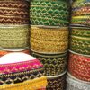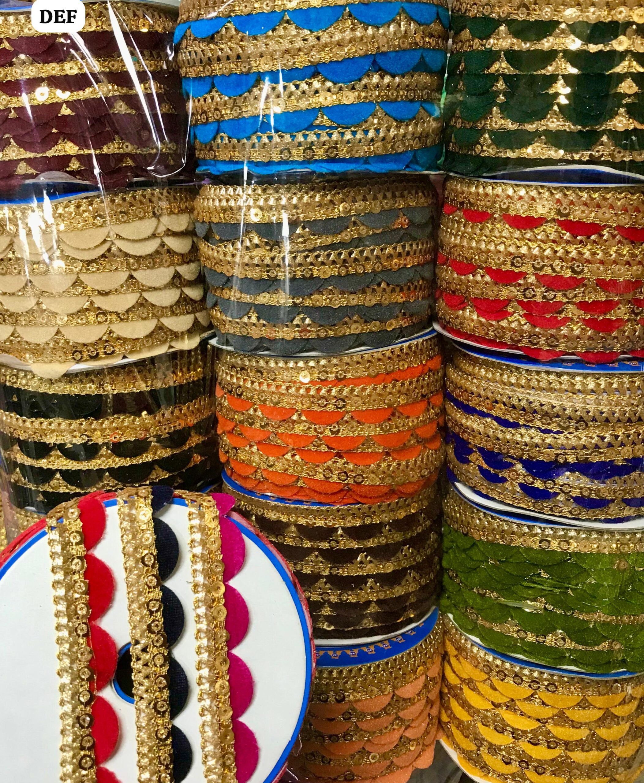 Elegant velvet scallop-edged trim with shimmering gold gota and sequin detailing.