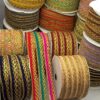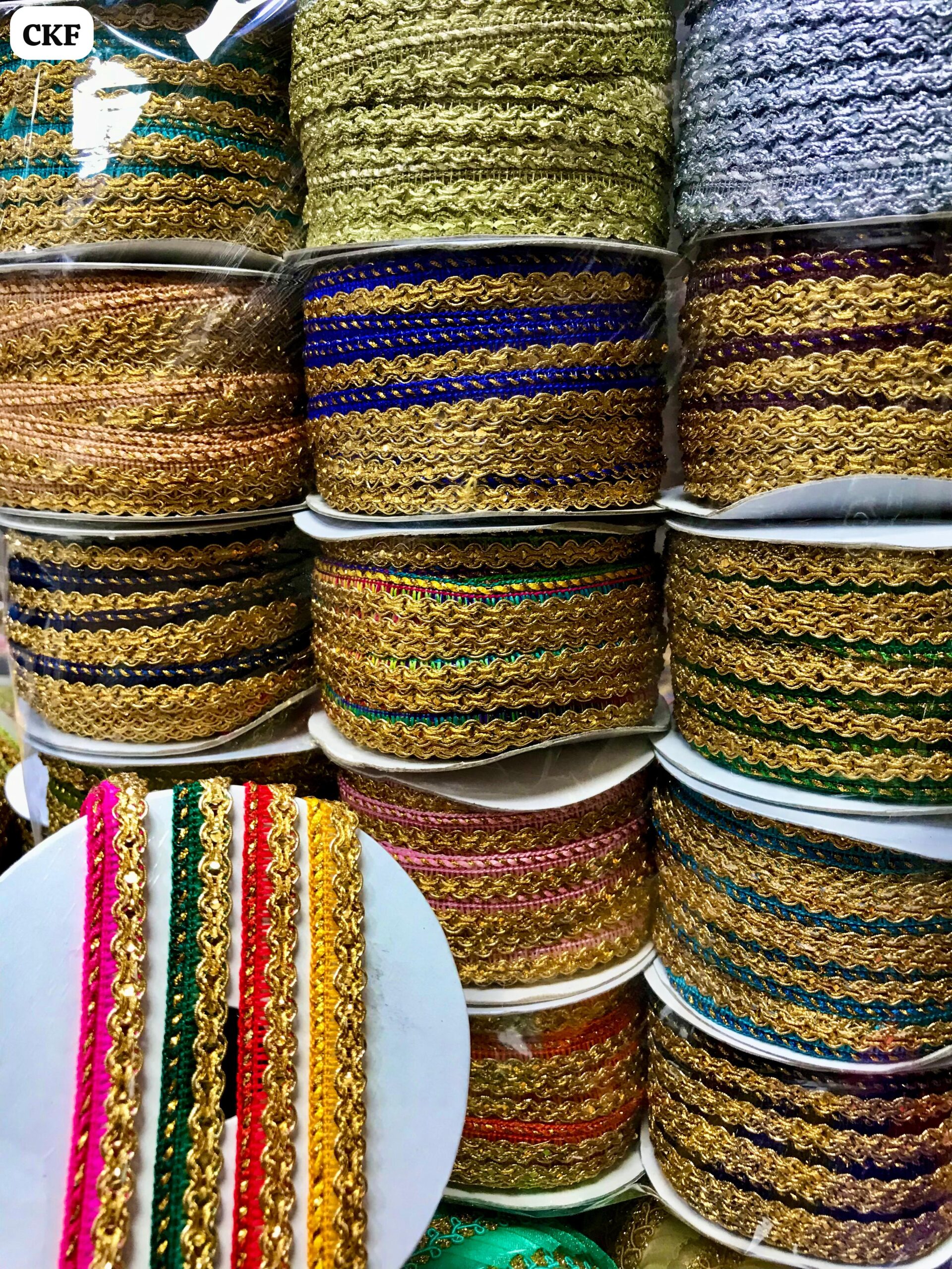 Dainty metallic gold wave-patterned lace with a thin colored silk core.